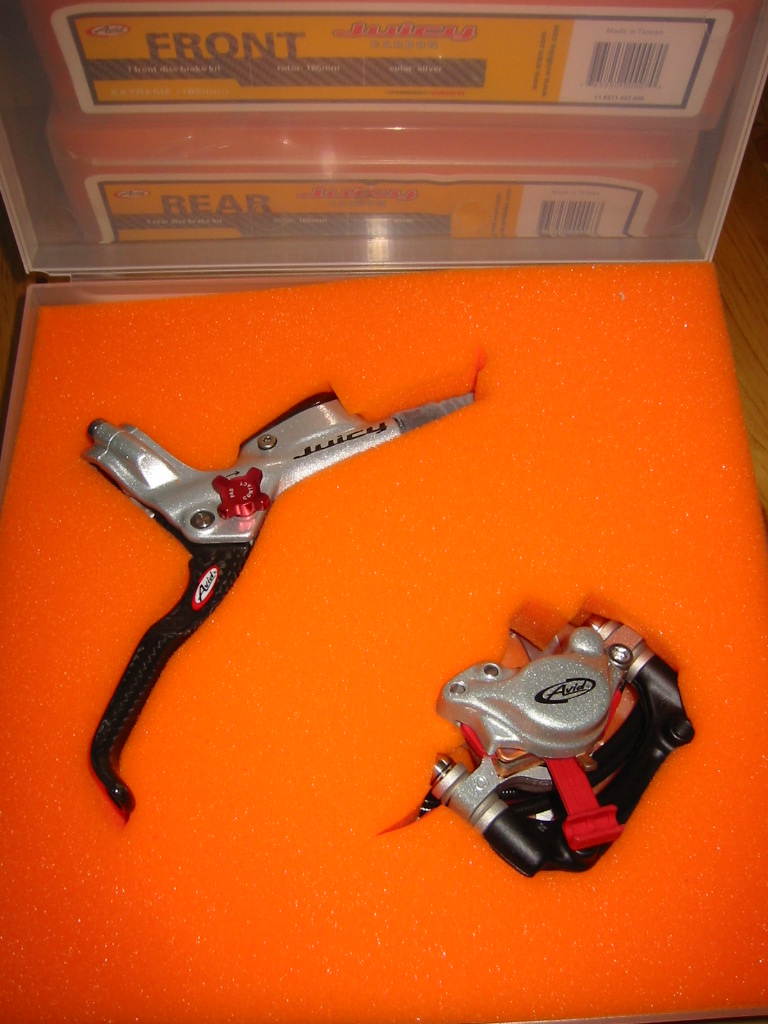 carbon levers and CNC machined adjusters. These are right lovely. Perfect modulation, bags of power, easy set up and damn sexy orange foam packaging - woooo...